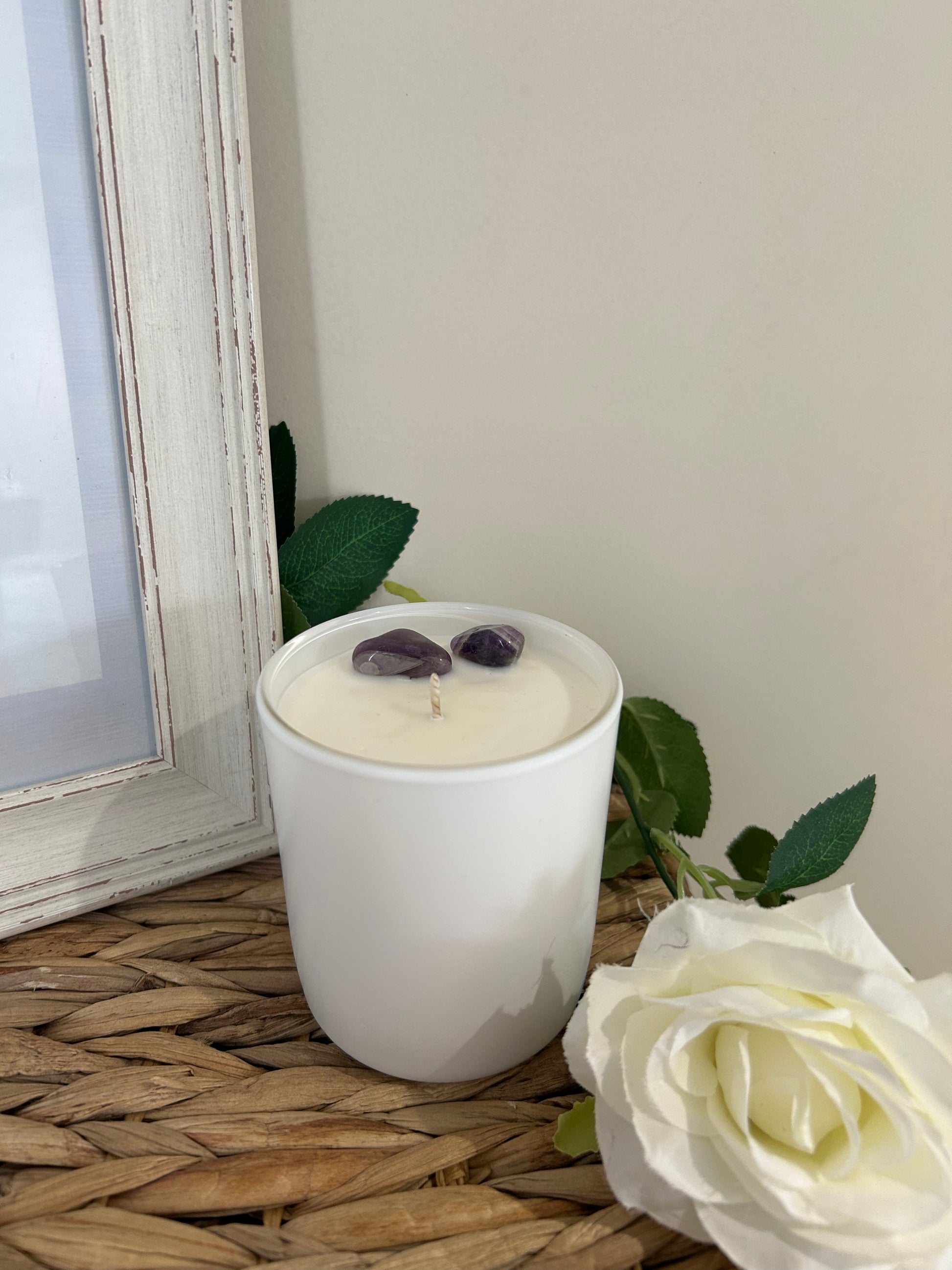 Our essential oil candles are more than just fragrant. Each is meticulously infused with the energetic properties of Amethyst, known for its ability to enhance intuition and spiritual awareness.